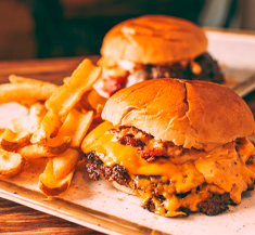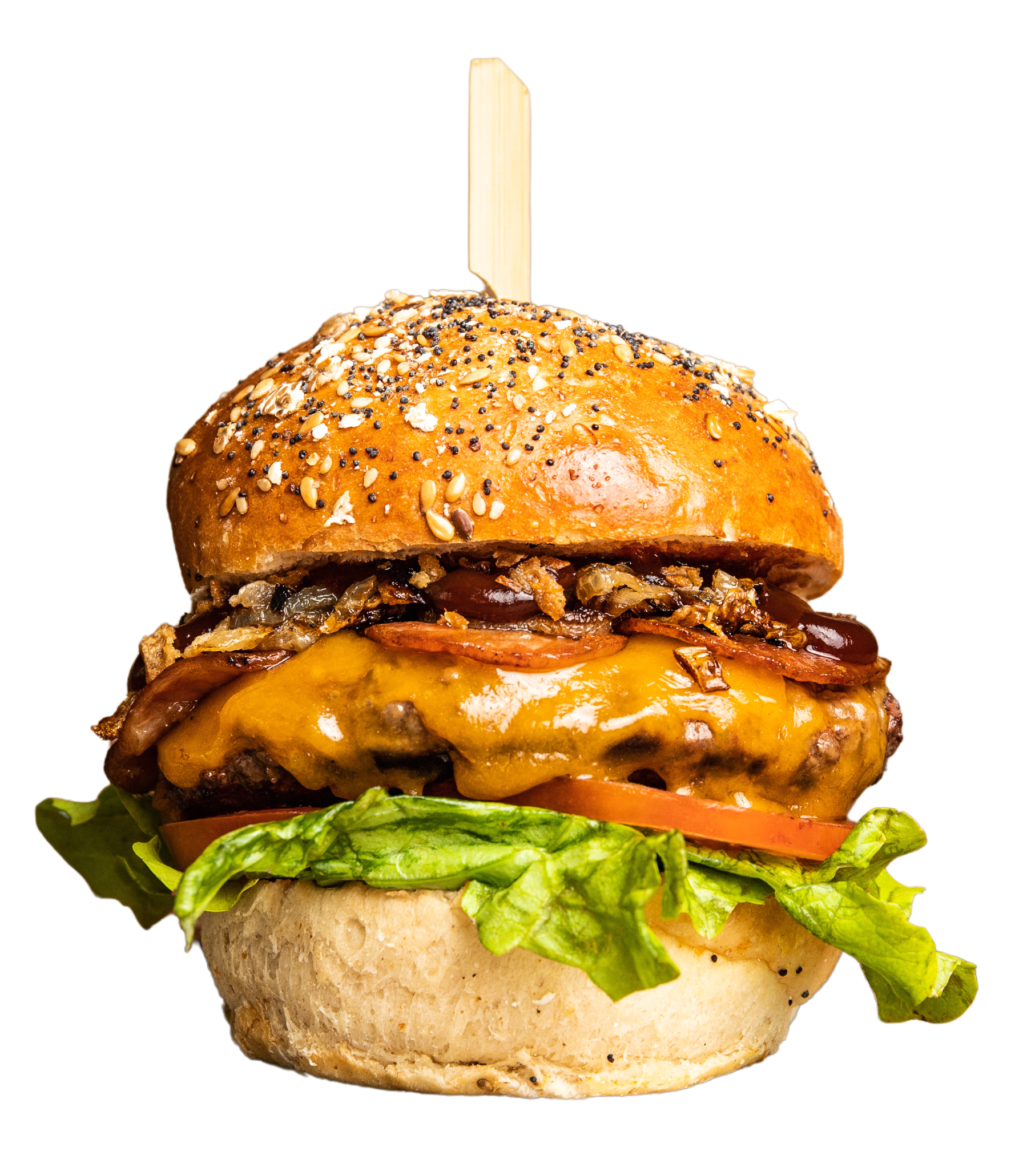 Pan potato burger de mantequilla, 2x – 95 Gr de ternera seleccionada (190 Gr), Cheddar rojo madurado, bacon, cebolla y mayonesa de bacon ahumado.