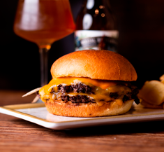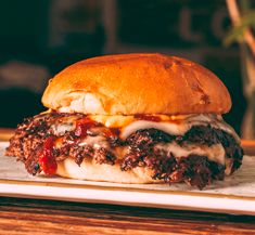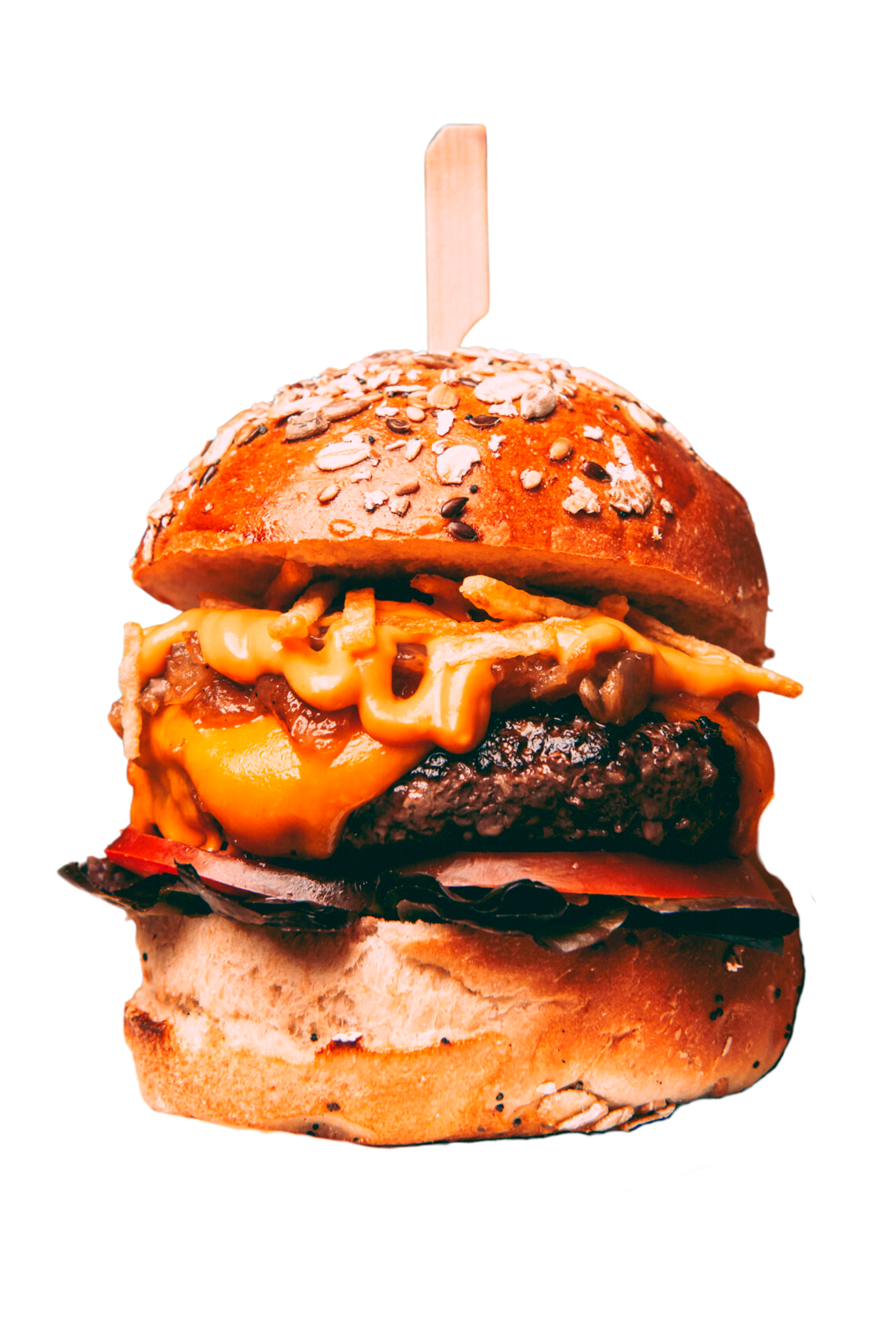 Pan potato burger, mantequilla, 2x – 95 Gr de ternera seleccionada (190 Gb), 3x – Cheddar rojo madurado, cebolla, y nuestra salsa secreta.