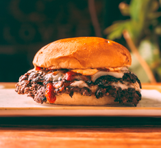 Pan potato burger de mantequilla, 2x – 95 Gr de ternera seleccionada (190 Gr), provolone, pimiento caramelizado y mayonesa pesto rojo.