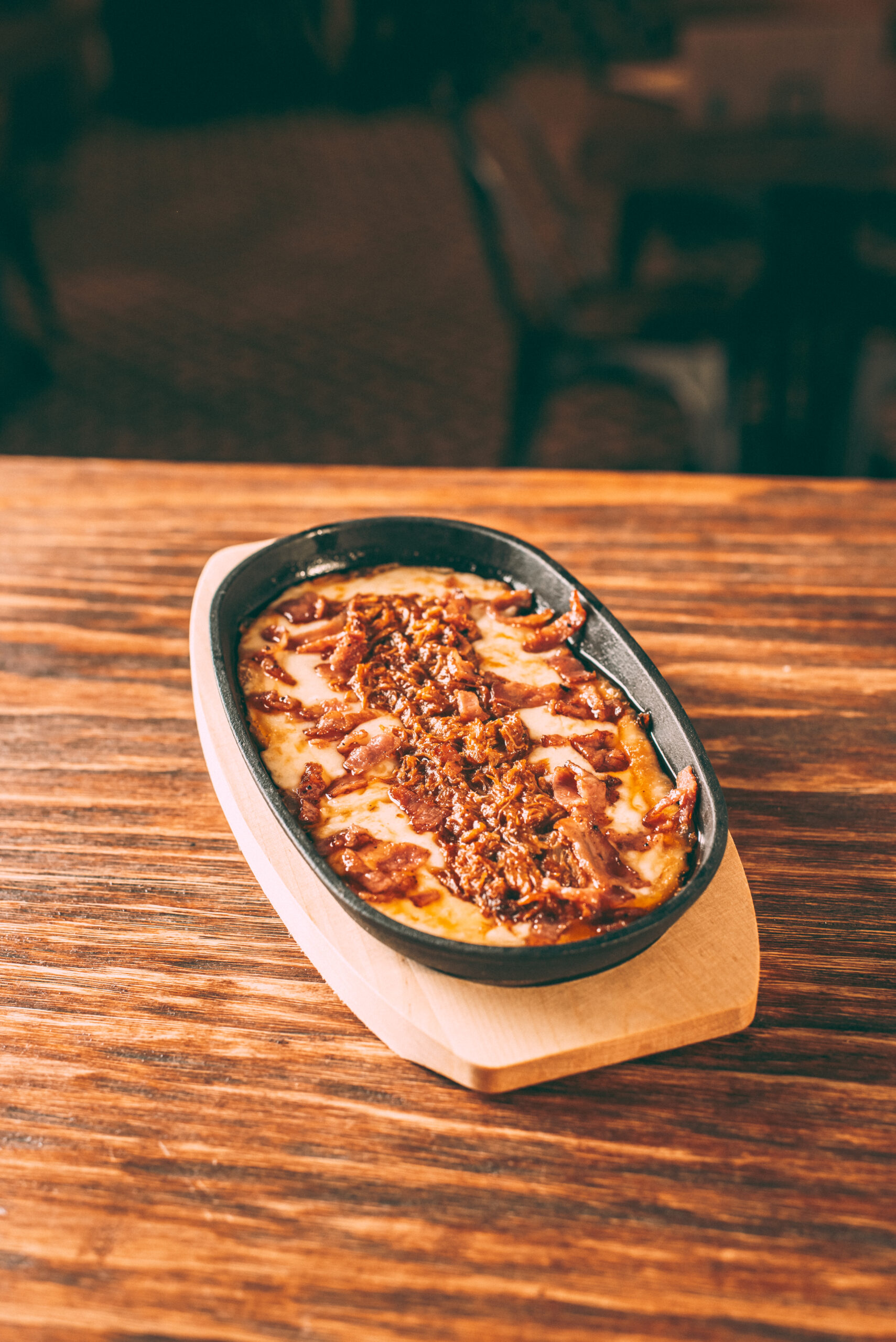 Bandeja de Provolone con salsa de tomate, bacon y pulled pork. Acompañado con nuestro pan de pizza.